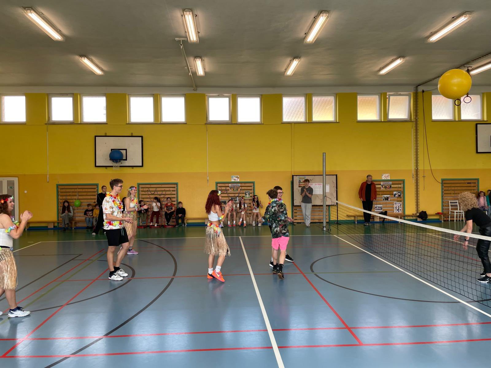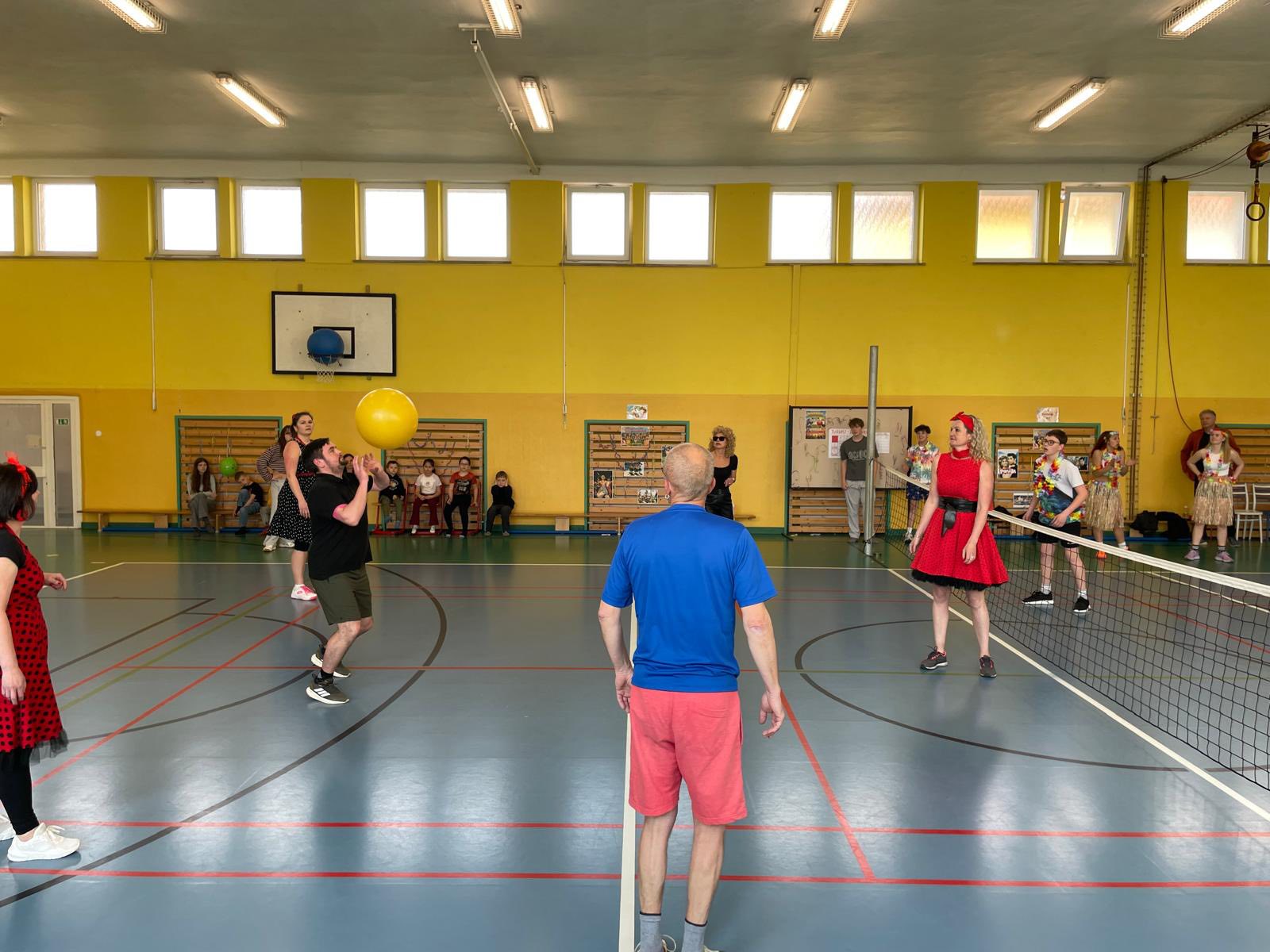 BODYBALL se stal na naší škole velmi oblíbeným sportem … po turnaji družstev celého druhého stupně jsme zorganizovali slíbený turnaj 9.A x UČITELÉ. Byl to boj plný úžasných výměn. Výkony byly naprosto vyrovnané. I když 1. set děti vyhrály, učitelé ze sebe vydali maximum a vývoj hry otočili ve svůj prospěch.