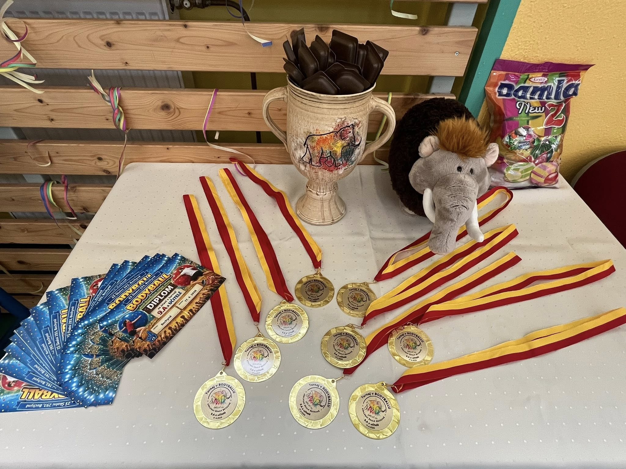 Tento turnaj byl věnován naší skvělé devítce, chtěli jsme, aby se po přijímacích zkouškách odreagovali. Jako poděkování za hru učitelé dětem věnovali medaile a pohár s logem školy, aby děti měly doma na školu památku. A pro nabraní energie děti jako výhru dostaly 2 maxi pizzy